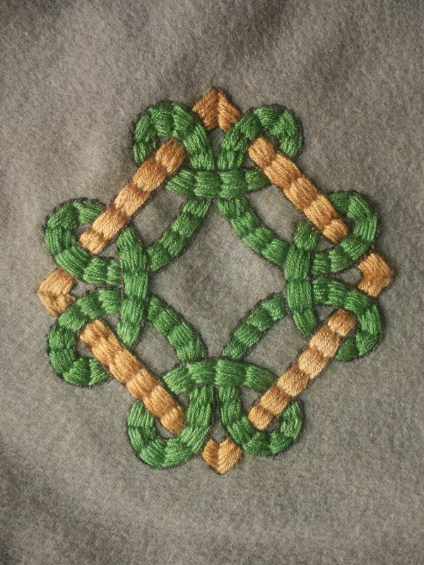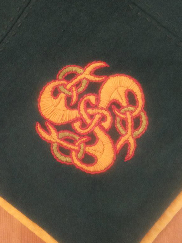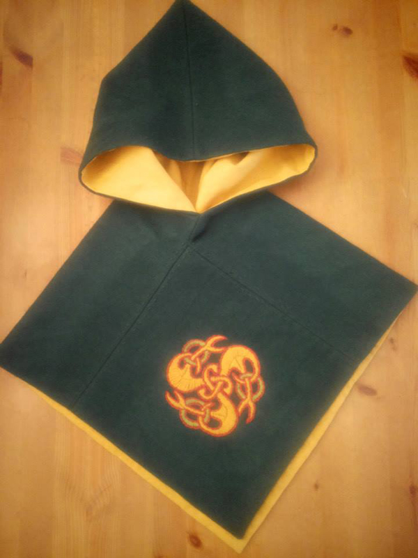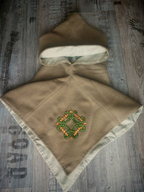 Intrepretation der Skjoldehamn Gugel. Dunkelgrüner Loden, innen gelbes Leinenfutter, mit einem gotländischem Motiv aus Wolle bestickt.