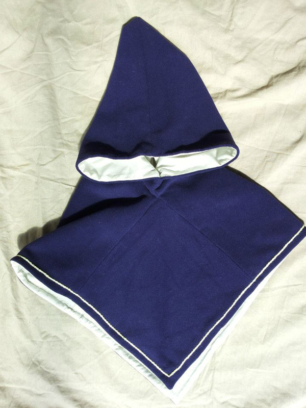 Intrepretation der Skjoldehamn Gugel. Mantelwolle in Lila, mit Leinenfutter und Umstickung im Schlingenstich.
